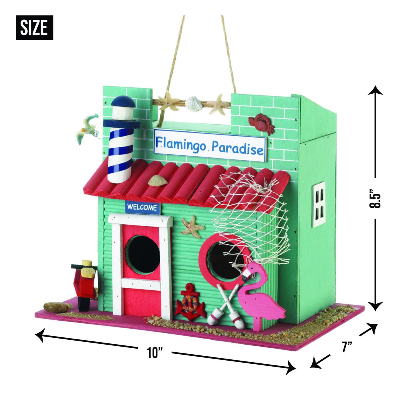 • A fun flamingo hangout by the sea, this novelty birdhouse welcomes your fine feathered friends. Seafoam blue, navy and bright coral hues make this birdhouse a cute conversation piece.
