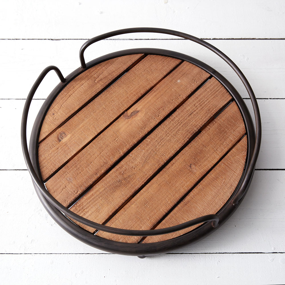14½'' dia. x 4''H. This sturdy tray features a metal frame and a wood base.